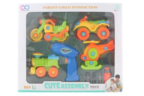 Sada šroubovacích dopravních prostředků. Balení obsahuje 4 dopravní prostředky, vrtačku a šroubovák. Vrtačka je na baterie - napájení na 2 AA baterie (nejsou součástí). Rozměry balení cca 37,5 x 32,5 x 11 cm. Věk 3+