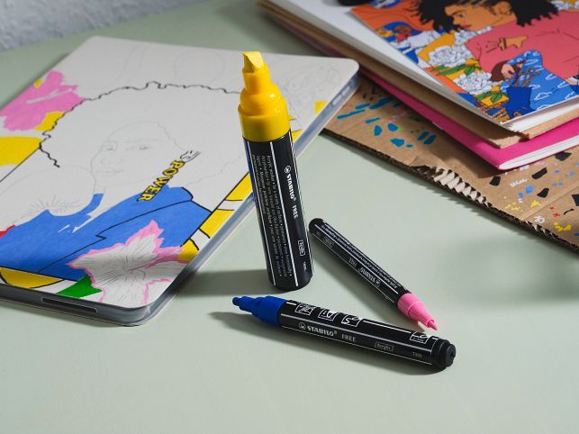S řadou STABILO FREE Acrylic Marker můžete téměř neomezeně navrhovat a individualizovat. K dispozici jsou popisovače se třemi pečlivě vybranými variantami hrotů a až 20 krycími barvami. Neprůhledná a světlostálá pigmentová akrylová barva, vhodná na téměř všechny povrchy, od papíru přes kámen až po keramiku, umělou kůži a dřevo. Každý může nechat volný průběh své kreativitě při psaní, malování, značkování, šrafování a konturování.