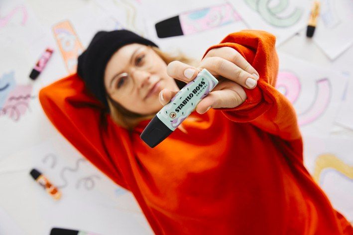 Trendová berlínská umělkyně Ju Schnee vytvořila design pro tuto speciální edici klasiky STABILO BOSS ORIGINAL. Díky tomu je práce se zvýrazňovačem ještě zábavnější, a to i u kreativních koníčků, jako je malování, psaní a skicování.
