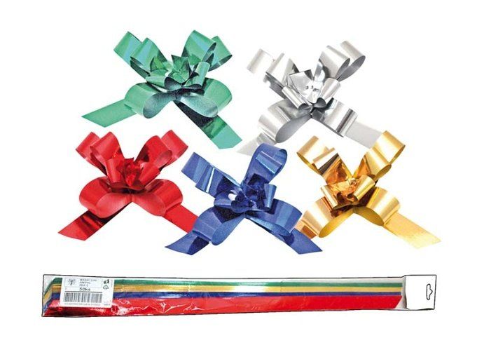 Stahovací stuhy jsou vhodné na ozdobení dárků. Jednoduchým zatažením za konce stuh, vytvoříte nádherný ozdobný květ nebo mašli. BALENÍ OBSAHUJE: - 50 ks stahovacích stuh v metalických barvách (zelená, zlatá, modrá, červená, stříbrná) Šíře: 2 cm Délka: 50 cm Uvedená cena je za 1 ks. Všech 50 ks je balených v sáčku se závěsem.