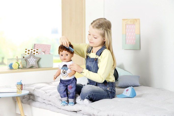 Starší bratříček BABY born Soft Touch ve velikosti 43 cm má na sobě tričko, kalhoty, tenisky a kšiltovku. Součástí balení je lahvička, hřeben na vlasy a 2 náramky přátelství – jeden pro malou maminku a jeden pro panenku.
