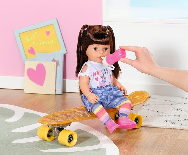 Tahle panenka je nejen starší sestřičkou, ale také nejlepší kamarádkou. Nápis „Best Friends“ najdeme i na jejím tričku. Zvířátka na tričku jsou jejími vzory. Je sportovní typ a je velmi pohyblivá. Díky ohebným kolenním kloubům dokáže sama stát.Když se při plavání naučí žabí nohy, dostane za odměnu napít vody z lahvičky. Někdy se jí z BABY born Vany vůbec nechce, takže panenka může uronit i nějaké panenkovské slzy.Hnědovlasá panenka má kvalitní vlasy a součástí balení jsou doplňky pro úpravu vlasů. Kromě sponek a gumiček do vlasů také dva barevné pramínky vlasů na sponce, které si může připnout do vlásků. Růžový a fialový pramínek se v jejích tmavých vlasech skvěle vyjímá. Je oblečena do kombinézy z trička s odhalenými rameny a šortek v džínovém vzhledu, pruhovaných legín a růžových bot.Starší sestřička BABY born.Se 6 realistickými funkcemi pro spoustu zábavy.Padne jí veškeré oblečení BABY born velikosti 43 cm.Různé hry s panenkou BABY born povzbuzují představivost a bylo prokázáno, že