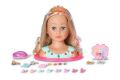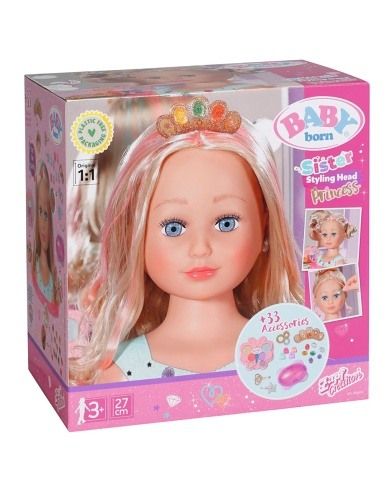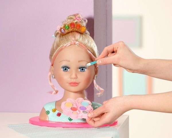 Vítejte v kosmetickém studiu pro malé princezny se smyslem pro ten nejlepší styl! Mladé make-up artistky mohou vytvářet ohromující make-up pomocí barevné a dermatologicky testované paletky s make-upem. Česací hlava s blonďatými vlásky prémiové kvality a jemnými barevnými melíry se snadno upravuje pomocí gumiček, sponek, skřipečků a kartáče. Ať už se budou tvořit romantické vlny, elegantní drdol nebo copánky a culíky – fantazii královských stylistů se meze nekladou. Vrchol elegance přichází ve formě jasně barevných nacvakávacích diamantů, kterými lze ozdobit třpytivou korunku nebo halenku. Jediné, co ještě chybí, jsou úžasné náušnice. A teď je princezna připravena oslnit všechny kolem. • Líčení a vlasy. • Pečlivě navržené doplňky rozvíjejí dětskou představivost a otevírají nové možnosti a témata hry. • Pro zábavnou a dlouhotrvající hru. Starší sestřička BABY born Česací hlava s paletkou s make-upem, kartáčem, 4 sponkami, 8 skřipečky, 4 gumičkami, korunkou a 14 nacvakávacími drahokamy.