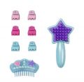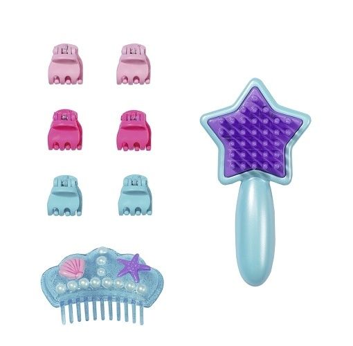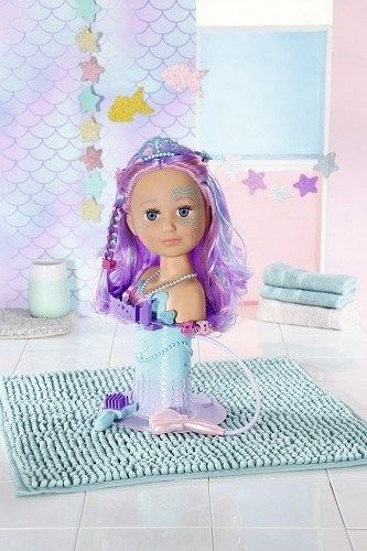 Něžná tvář mořské víly s dlouhými fialkovými vlásky, čeká na malou kadeřnici, která se bude starat o její nové účesy a také líčení. Holčičky se formou hry mohou zdokonalit v péči také o svoje vlásky a celkový výzor. Kartáčem mohou holčičky sčesávat vlásky do přiložených gumiček a zdobit je ozdobnými skřipci. Starší sestřička má opravdové řasy, které můžeš nalíčit barevně. Detailně zpracovaná hlava lze otáčet do strany.Odkládací plocha na doplňky má po stranách držák na upevnění kartáče a sprchové hlavice. Hlava s ramenní částí má velikost 22 cm, celková výška produktu je 37,5 cm.Po vyjmutí sprchové hlavice z držáku se spustí voda.Nestojí-li česací hlava ve vodě, funkce spuštění vody se nezapne díky bezpečnostní pojistce.