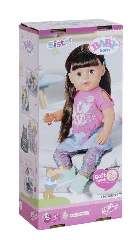 Starší sestřička BABY born Soft Touch brunetka ve velikosti 43 cm má na sobě tričko, sukýnku, legíny a tenisky. Součástí balení je lahvička, kartáč na vlasy, 2 gumičky, 4 sponky a 2 náramky přátelství – jeden pro malou maminku a jeden pro panenku.