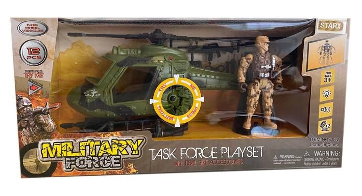 Vojenská sada se světelnými a zvukovými efekty. Obsahuje vojenské vozidlo nebo helikoptéru, postavičku vojáka a další příslušenství.