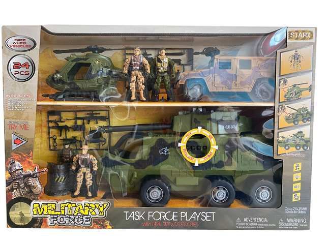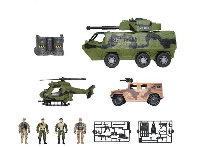 Velká sada vojenských vozidel se zvukovými a světelnými efekty. Sada obsahuje obrněný transporter, helikopteru, jeep, vojáčky a salší příslušenství.