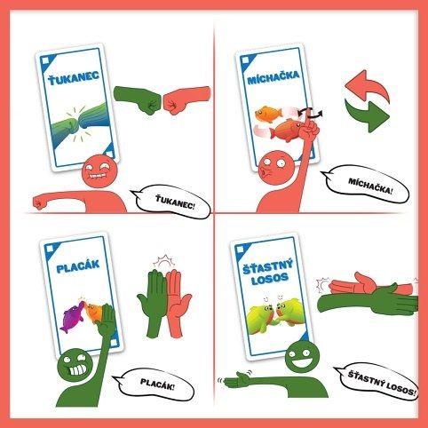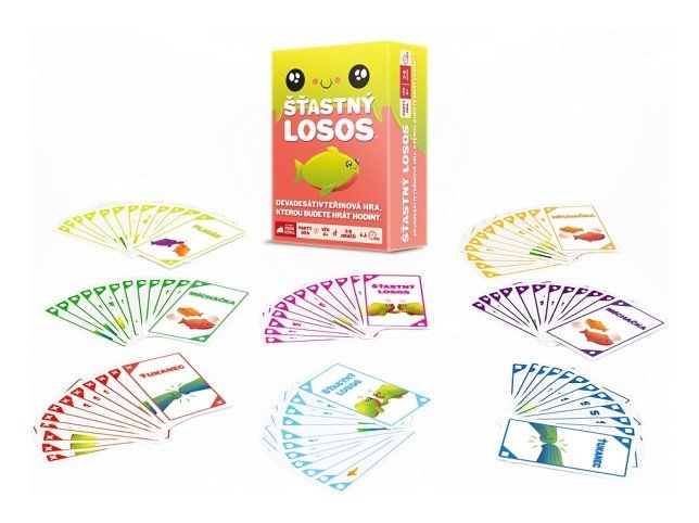 Devadesátivteřinová hra, kterou budete hrát hodiny. Šťastný losos je rychlá, pohybová a HLASITÁ hra, která vás rozesměje za méně než dvě minuty. Takže vykliďte prostor, zbavte se židlí a pokud vám srdeční tep vyskočí na 120 úderů za minutu, nejspíš to děláte dobře. Jak na hru? Na každé kartě je jednoduchá akce, ke které budete potřebovat parťáka. Hráči zběsile vykřikují své akce a hledají příhodného spoluhráče. Jakmile ho najdou, vykonají společnou akci, odhodí použitou kartu a pokračují dál. Vyhrává hráč, který se jako první zbaví všech svých karet! Pokud z nějakých, jistě dobrých, důvodů potřebujete být při hraní potichu, vyzkoušejte tichou variantu hry, která se skvěle hodí do přecpaných barů, knihoven a jiných míst, ze kterých byli naši testeři vykopnuti. Obsah balení: 96 karet česká pravidla