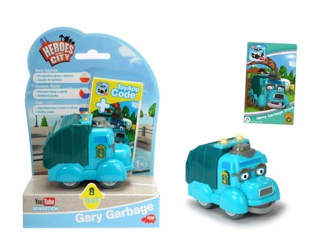 Popelářské auto ze seriálu Hrdinové velkoměsta (Statečná autíčka). Volnoběh, světelný a zvukový efekt, lze vypnout. 3 jazyky: čeština, polština a ruština, které lze přepínat. Délka autíčka 8 cm.