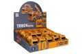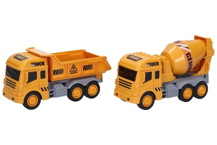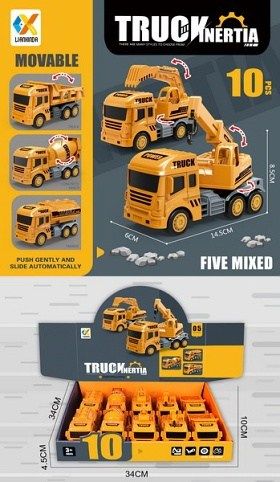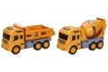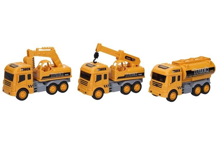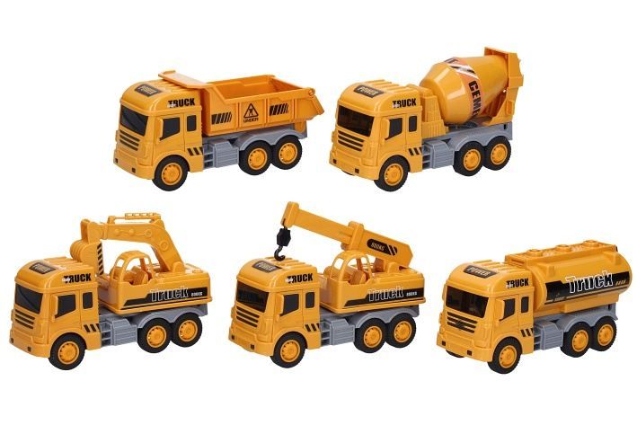 Stavební auto. Rozměry 14,5x6x8,5 cm. Na setrvačník. 10 ks display box. 5 variant - cisterna, domíchávač, bagr, jeřáb, sklápěč.