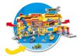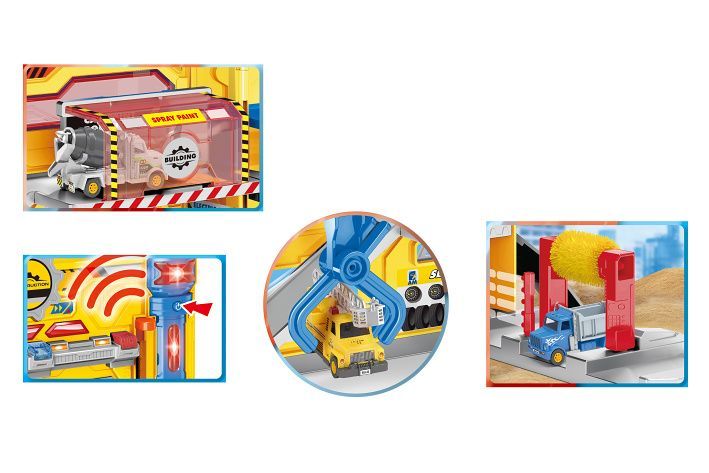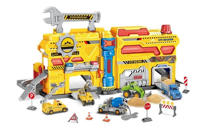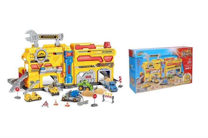 Stavební stanice přenosná. Rozměry 55x20x25 cm. Světelné a zvukové efekty. 3xAG13 baterie součástí. Součástí 2 auta s volnými koly, značky, nálepky. Obrázkový návod na sestavení součástí. Samolepky nalepte dle obrázků na obalu.