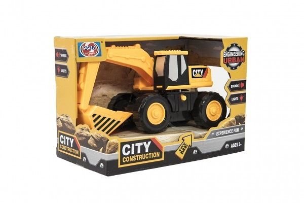 Stavební stroj bagr/nakladač 20cm na setrvačník na baterie se světlem a zvukem v krabičce