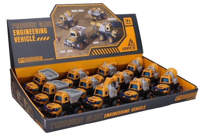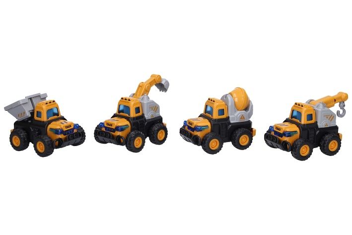 Stavební stroje. Velikost 12 cm. Volná kola, pohyblivé manuální prvky. Display box - 12 ks. 4 varianty- domíchávač, jeřáb, bagr, sklápěč.
