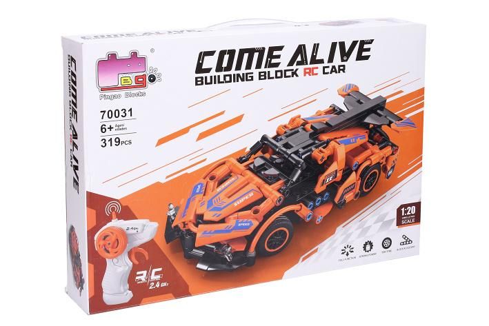 Stavebnice Auto oranžové RC na dálkové ovládání. 319 dílků. Rozměry 18,6x8,8x5,6 cm. Pistolový ovladač. Frekvence 2. 4GHz. Bateriový pack 3. 7V 350mAh Li-ion do auta součástí, 2xAA do ovladače nejsou součástí. USB kabel součástí. Přepínač ON/OFF na spodní straně auta a na boční straně ovladače. Obrázkový návod bez textu a nálepky součástí.
