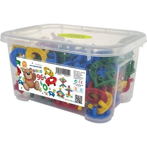 Kroužková stavebnice Disco 96 box obsahuje 96 dílků ve 4 barvách. Je vhodná již pro nejmenší děti od 1 roku. Pomáhá jim procvičovat cit v prstíkách a poznávat základní barvy.