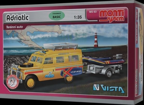 Stavebnice Monti 63 Land Rover-vlek s loďkou/člunem 1:35 v krabici 22x15x6cm