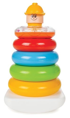 Skládací pyramida z 5 barevných kruhů na podstavci, ten vrchní je průhledný s kuličkami.. Výška výrobku 23 cm. Pomáhá dítěti v rozvoji motoriky.