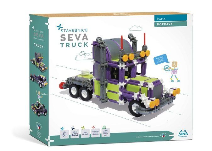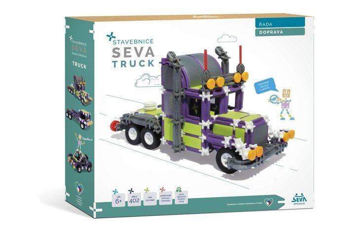 "Pomáhám tátovi řídit kamion!" Se stavebnicí SEVA DOPRAVA Truck můžete stavět silný tahač, buginu, malý náklaďák a celou řadu dalších strojů a s nimi jezdit kam se vám jenom zachce... Hlavně se nenechte ve své fantazii omezovat. Balení obsahuje 402 dílků.