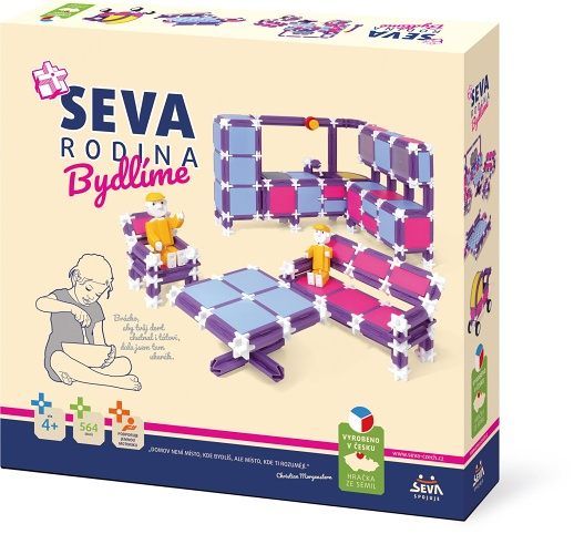 Pro velký zájem jsme rozšířili naši řadu Seva Rodina o novou (podzim 2020) stavebnici zaměřenou na téma bydlení. Díky krásným a pestrým barevným kombinacím, kde dominuje fialová, růžová a světle modrá barva, si tato stavebnice určitě získá pozornost nejedné šikovné holčičky! Tato stavebnice obsahuje celkem 564 dílků, ze kterých si můžete sestavit krásné a originální bydlení jak pro originální panáčky Seváčky (dvě figurky Seváčka jsou součástí balení), nebo své vlastní figurky či malé panenky. Co všechno si můžete ze stavebnice Bydlení sestavit? Záleží pouze na Vás a na Vaši fantazii! Připravili jsme pro Vás několik inspirativních tipů jako např. moderní rohovou kuchyňskou linku samozřejmě se dřezem na mytí nádobí a vestavěnou lednicí. K tomu kuchyňský stůl se židlí nebo pohovkou pro dvě a tři figurky, které si zde můžou spolu posedět a vychutnat třeba teplý čaj nebo nějaký sladký pamlsek. Co by bylo bydlení bez ložnice? Ani zde nepřijdete zkrátka, můžete si sestavit tzv. letiště – širokou postýlku pro pohodlné spaní. Malé stavitelky určitě ocení i malé noční stolky u postele, kam si mohou odložit knížku, nebo šálek s čajem (nejsou součástí stavebnice).