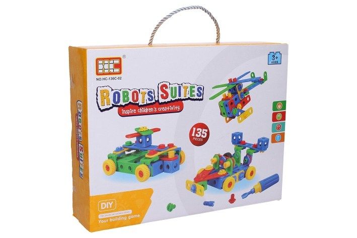 Stavebnice šroubovací. Obsahuje 135 dílků, šroubovák, a obrázky výrobků pro inspiraci.