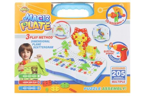 Šroubovací stavebnice s vrtačkou. Balení obsahuje celkem 205 dílů, vrtačku, šroubovák, 2x klíč, 2x kleště a praktický plastový kufřík, do kterého lze díly uschovat. Součástí balení je také návod. Napájení vrtačky je na 2 AA baterie (nejsou součástí balení). Rozměry balení cca 31 x 24,5 x 6,5 cm. Věk 3+