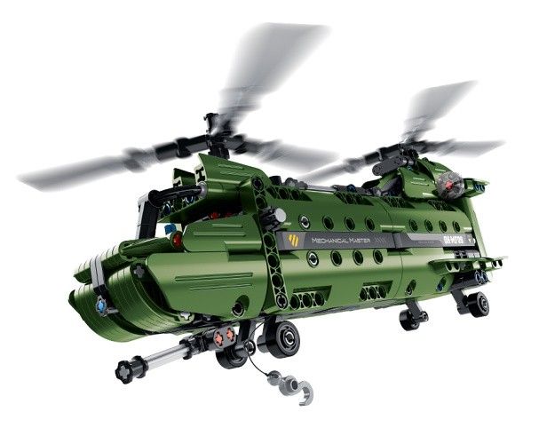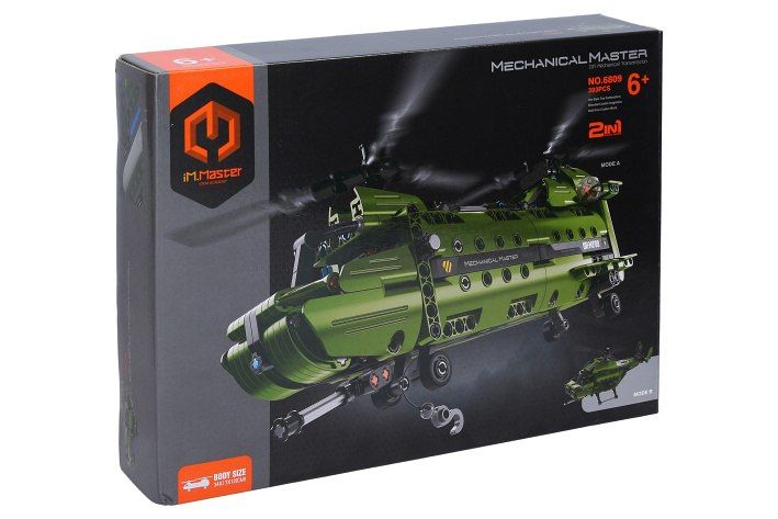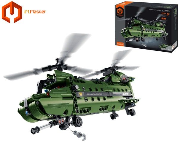 iM. Master Stavebnice vrtulník 2v1. Velikost vrtulníku se dvěma vrtulemi 34x17x12 cm, vrtulníku s jednou vrtulí 30x17x13 cm. 393 dílků. Lze sestavit dva různé modely vrtulníku z jedné sady dílků. Složený model má manuálně pohyblivé části (vrtule, naviják, otáčení děla).