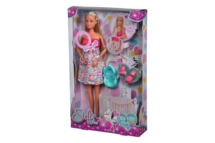 Steffi jako nastávající maminka s miminkem v bříšku. Když stiskneme tlačítko ve tvaru srdce na jejím náhrdelníku, uslyšíme tlukot srdce miminka. Když se dítě narodí a vykoukne z bříška, dá o sobě vědět křikem. Když pak znovu stiskneme srdíčko na náhrdelníku, postupně uslyšíme další zvuky - pláč, usínání při ukolébavce a smích. Sada obsahuje také rodný list k vyplnění, čepičku a zavinovačku pro novorozence, hračku medvídka a dětské nosítko. Panenka Steffi má ohebné klouby na loktech a zápěstích. Velikost panenky 29 cm.