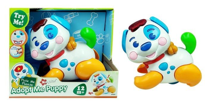 Interaktivní štěňátko pro ty nejmenší. Štěňátko má několik funkcí, vydává různé zvuky, svítí. Pokud štěňátko zmákneš, ono půjde. Pejsek má obojek a na něj mu můžeš nalepit samolepku a napsat mu tam jeho jméno.Hračka obsahje také regulátor zvuku. Výrobek je vhodný pro děti od 12 měsíců. Vyžaduje 2 AG13 baterie.