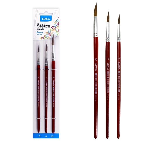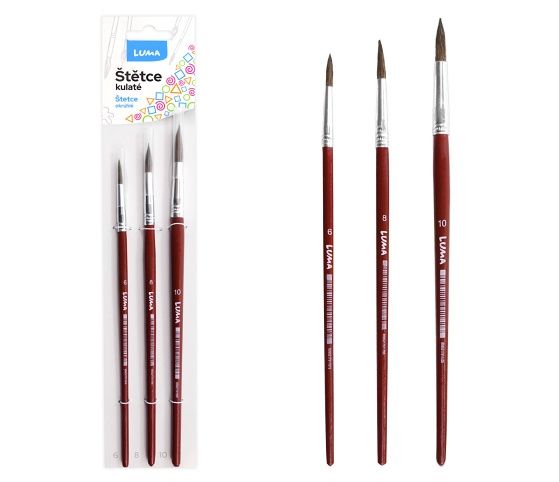 Přírodní materiál- lakovaná rukojeť s bezešvou hliníkovou zděří- vhodné na malbu vodovkami, akvarel, temperu i olej- vhodné pro školáky, předškoláky i pro umělce- v sadě kulaté štětce č. 6, 8, 10