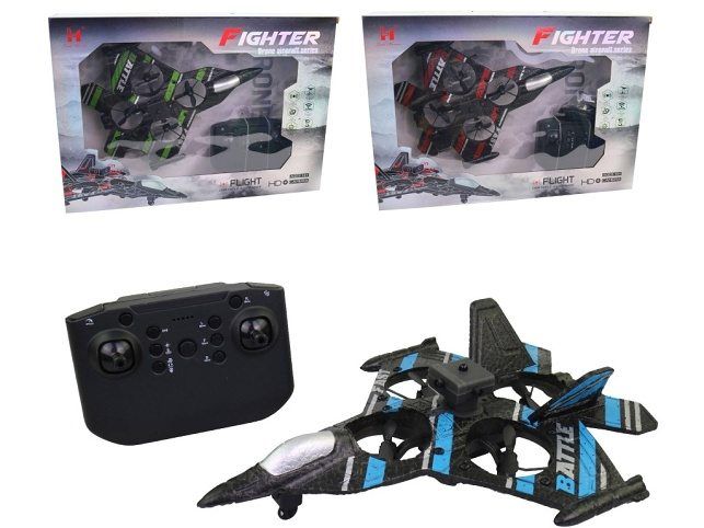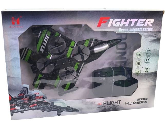 Stíhací letadlo na ovládání, 2,4 GHz, 24 cm. Stíhačka má mnoho funkcí jako je automatické přistání a vzlet, 6-osý gyroskop, umí udělat otočku o 360stupňů, má vyhybání překážkám, zvolení rychlosti, bez kamery. Materiál: plast. Rozměr balení: 25 x 9 x 36 cm. Rozměr produktu: 24 cm. Napájení ovladače: 3 x AAA baterie nejsou součástí balení. Balení obsahuje: stíhačku, ovladač, USB nabíjecí kabel, náhradní vrtulky, šroubovák. Vhodné od 14 let.