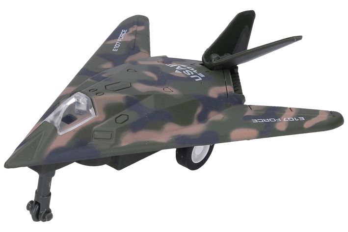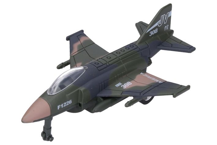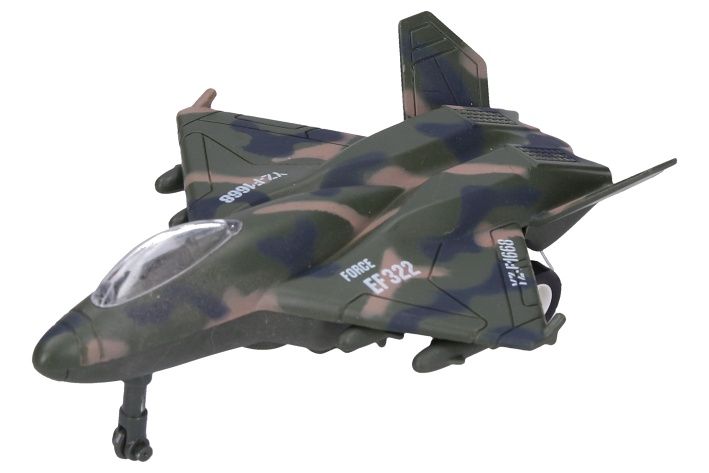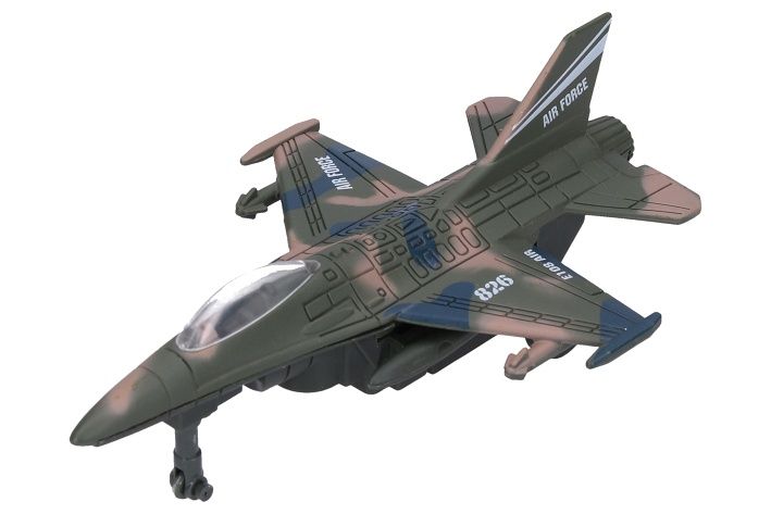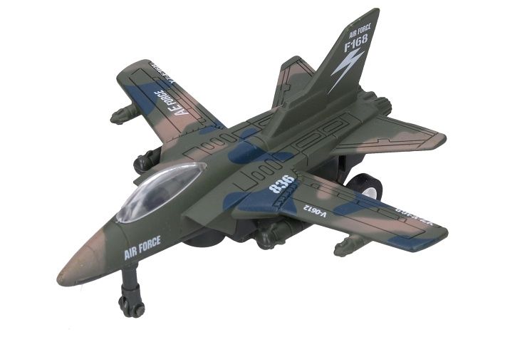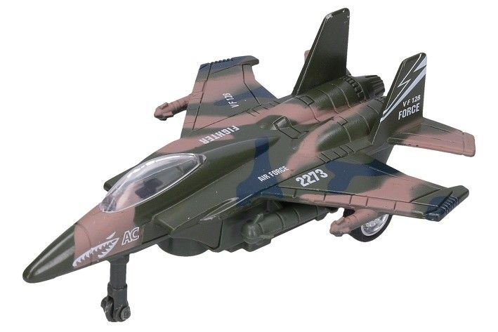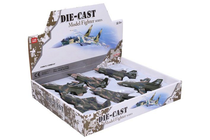 Stíhačka, kovová. Velikost 12 cm. Display box - 6 ks. 6 variant. Na zpětné natažení.