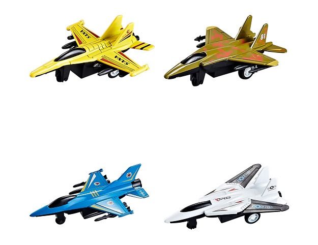 Stíhačka kovová. Rozměry 10x7x4 cm. Na zpětné natažení. 12 ks display box. 4 varianty - bílá, modrá, zelená, žlutá.