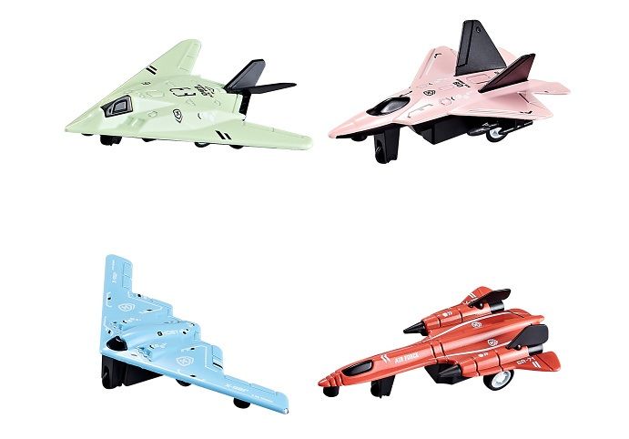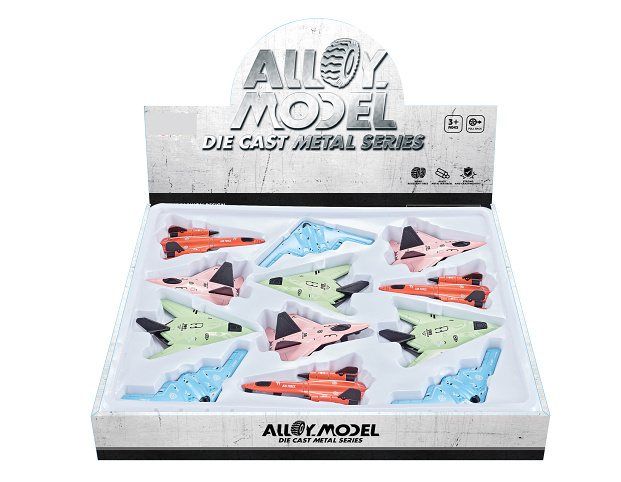 Stíhačka kovová. Rozměry 11,5x8x2,5 cm. Na zpětné natažení. 12 ks display box. 4 varianty - modrá, zelená, růžová, červená.