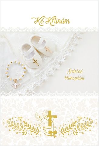 Přání o rozměru 170 x 115 mm je zdobeno zlatou ražbou a je dodávano v sáčku s obálkou. Vnitřní text: "Křest je radostí celé církve, z pramene boží milosti se rodí nový člověk. Přejeme Vám, abyste své děťátko vychovali ve víře a dali mu prožít Vaši vlastní lásku, věrnost, dobrotu a krásu. "