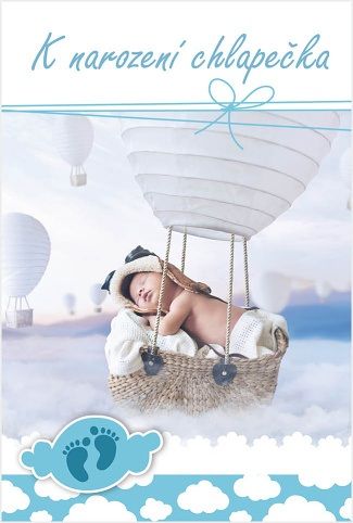 Vnitřní text: "Nový život právě přilétá. Ať Vás naplní štěstím, zdravím a radostí. Srdečně Vám gratulujeme!". Přání o rozměru 115x170mm je tištěno na strukturovaném papíře a zdobeno modrou ražbou. Dodáváme v sáčku s obálkou.