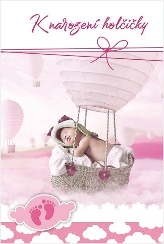 Vnitřní text: "Nový život právě přilétá. Ať Vás naplní štěstím, zdravím a radostí. Srdečně Vám gratulujeme!". Přání o rozměru 115 x 170 mm je tištěno na strukturovaném papíře a zdobeno růžovou ražbou. Dodávame v sáčku s obálkou.