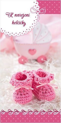Vnitřní text: "Ať Vám Vaše děťátko přinese hodně lásky, smíchu a něhy, a prozáří každý den štěstím a radostí." Přání o rozměru 100x200mm je tištěno na strukturovaném papíře a zdobeno růžovou ražbou. Dodáváme v sáčku s obálkou.
