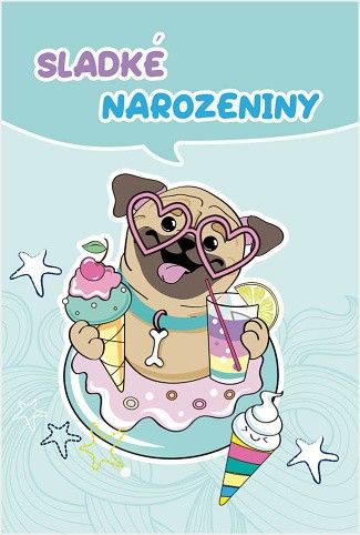 Vnitřní text: "Přejeme Ti krásné narozeniny, veselou oslavu a spoustu krásných dárečků. Všechno nejlepší!". Přání o rozměru 115x170mm je dodáváno v sáčku s obálkou.