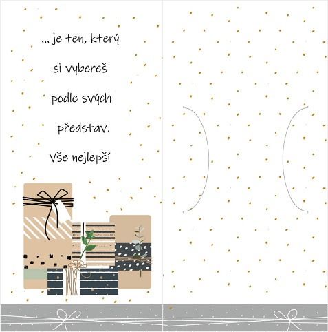 Vnitřní text: ". je ten, který si vybereš podle svých představ. Vše nejlepší přeje". Luxusní přání o rozměru 100 x 200 mm je zdobeno ražbou. Přání je vytištěno na speciálním strukturovaném papíru s perletí a je dodáváno v sáčku s obálkou. Uvnitř přání je výsek vhodný na peníze nebo poukaz.