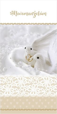 Vnitřní text: "Ať je Vaše manželství stejně krásné a šťastné jako láska, která Vás k němu přivedla, přeje". Přání o rozměru 115x170mm je tištěno na strukturovaném papíře a zdobeno zlatou ražbou. Dodáváme v sáčku s obálkou.