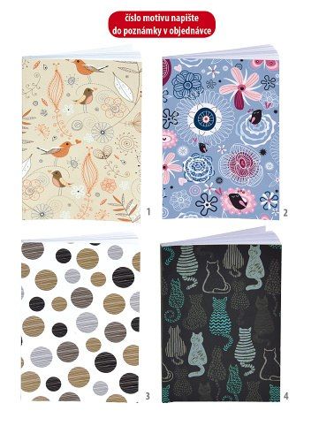 Linkovaný blok A7 lepený s měkkými deskami obsahuje 144 stran. Bloky nabízíme ve čtyřech designech. Do poznámky v objednávce uveďte prosím Vámi vybraný design.