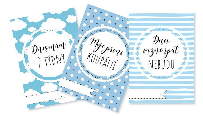 Jmenuji se, vážím, Dnes mám 1 týden, Dnes mám 2 týdny, Dnes mám 3 týdny, Dnes mám 1 měsíc, Dnes mám 2 měsíce, Dnes mám 3 měsíce, , Dnes mám 4 měsíce, Dnes mám 5 měsíců, Dnes mám 6 měsíců, Dnes mám 7 měsíců, Dnes mám 8 měsíců, Dnes mám 9 měsíců, Dnes mám 10 měsíců, Dnes mám 11 měsíců, Dnes je mi 1 rok, Pasu koníčky, Moje první koupání, První den doma, Umím pořádně řvát, Můj první zoubek, Umím říct máma, Umím říct táta, Můj první krůček, Moje první slovo, Poprvé na nočníku, Moje první lžička, Spinkám jako andílek, Dnes vážně spát nebudu, Už se umím přetočit na bříško, Mám nejkrásnější úsměv, Moje oblíbená hračka, Už umím sedět, Už umím stát