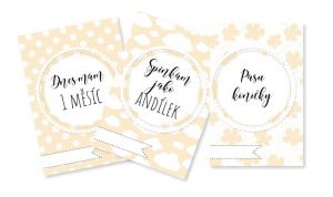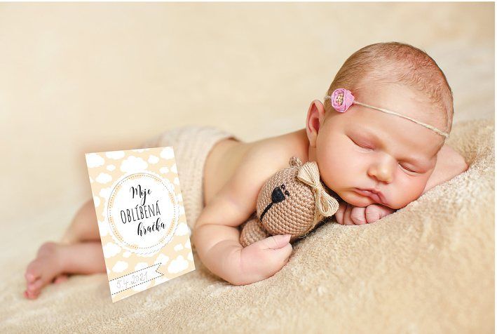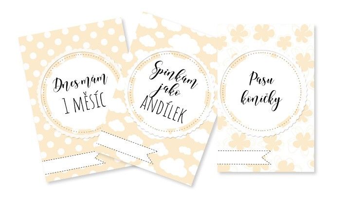 Jmenuji se, vážím, Dnes mám 1 týden, Dnes mám 2 týdny, Dnes mám 3 týdny, Dnes mám 1 měsíc, Dnes mám 2 měsíce, Dnes mám 3 měsíce, , Dnes mám 4 měsíce, Dnes mám 5 měsíců, Dnes mám 6 měsíců, Dnes mám 7 měsíců, Dnes mám 8 měsíců, Dnes mám 9 měsíců, Dnes mám 10 měsíců, Dnes mám 11 měsíců, Dnes je mi 1 rok, Pasu koníčky, Moje první koupání, První den doma, Umím pořádně řvát, Můj první zoubek, Umím říct máma, Umím říct táta, Můj první krůček, Moje první slovo, Poprvé na nočníku, Moje první lžička, Spinkám jako andílek, Dnes vážně spát nebudu, Už se umím přetočit na bříško, Mám nejkrásnější úsměv, Moje oblíbená hračka, Už umím sedět, Už umím stát