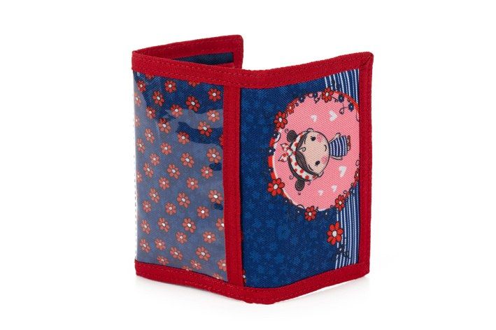 Praktická peněženka na krk má na vnější straně průhlednou kapsičku na průkazy či karty. Uvnitř je praktický organizér s 5 kapsičkami na bankovky a drobnosti, kapsička na zip na mince a kovový kroužek na klíče. Peněženka se zavře suchým zipem a zavěsí na krk látkovou šňůrkou.