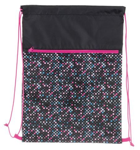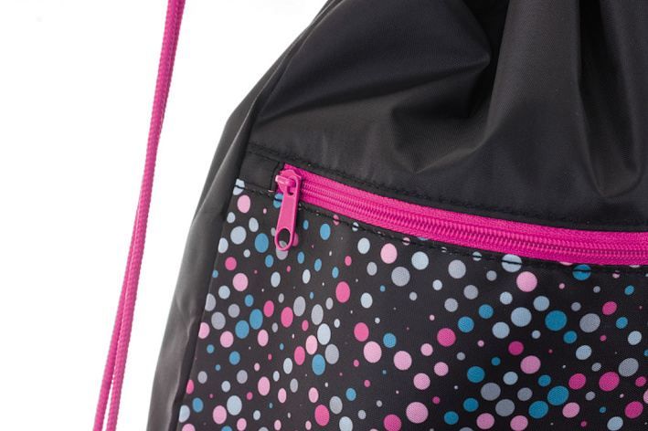 Sáčky na cvičky jsou praktickým doplňkem školní aktovky pro uložení přezůvek či věcí na tělocvik. Vodoodpudivý pevný materiál udrží věci v suchu. Kapsa na zip oddělí boty od ostatního oblečení. Stahovací šňůrka spojená se spodní částí promění sáček v malý batůžek na záda. Rozměr: 32 x 44 cm.