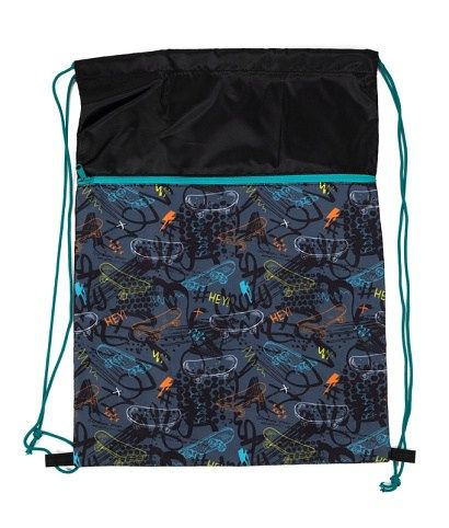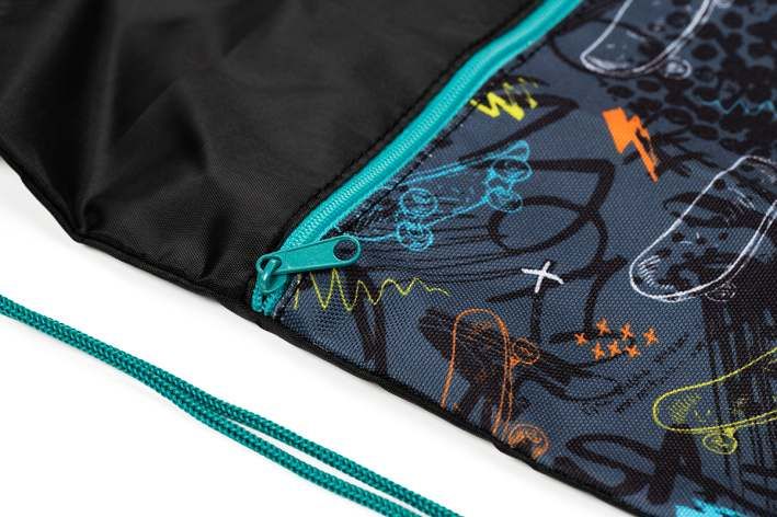 Sáčky na tělocvik jsou praktickým doplňkem školní aktovky pro uložení přezůvek či oblečení na tělesnou výchovu. Vodoodpudivý pevný materiál udrží věci v suchu, kapsa na zip oddělí boty od ostatního oblečení. Stahovací šňůrka spojená se spodní částí promění sáček v malý batůžek na záda. Rozměr: 32 x 44 cm