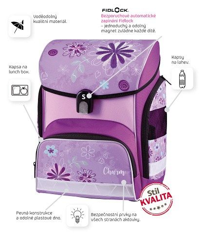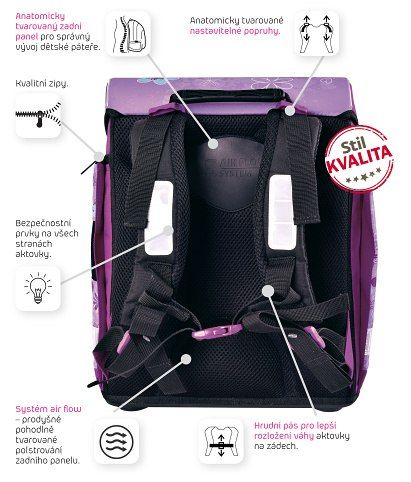 Školní aktovka pro prvňáčka (VHODNÁ PRO 1. 3. TŘÍDU). Kvalitní, ergonomicky tvarovaná odlehčená školní aktovka je vybavena reflexními prvky a anatomicky tvarovanými zády s pevnou konstrukcí. Školní aktovky Stil jsou ověřeny odborníky. PARAMETRY školní aktovky: Rozměr: výška 38 cm, šířka 32 cm, hloubka 22 cm. Hmotnost: 1 kg. Nosnost: 7 kg. Objem: 17 l. VLASTNOSTI školní aktovky. 3D ZÁDOVÝ SYSTÉM. Aktovka perfektně sedí na zádech. Anatomický zádový panel se přizpůsobí páteři dítěte a systém Air Flow a prodyšné polstrování umožní cirkulaci vzduchu a příjemné nošení. Hrudní pás s kvalitní přezkou zajistí dobré usazení aktovky na zádech dítěte. FIDLOCK: moderní patentové zapínání s magnetem pro snadné otevírání a zavírání aktovky jednou rukou. Velmi praktické a jednoduché řešení pro školáky - při přiložení víka se samo zapne. BEZPEČNOST: bezpečnostní prvky jsou velmi důležité, proto je aktovka vybavena reflexní pásky na všech stranách batohu, které zaručí lepší viditelnost a bezpečnost dítěte ve tmě. VNITŘNÍ USPOŘÁDÁNÍ: Hlavní vnitřní komora je rozdělená látkovou přepážkou pro lepší uložení pomůcek. V přední části komory je kapsička pro uložení drobností. Přední kapsa aktovky je určena pro svačinový box nebo penál.