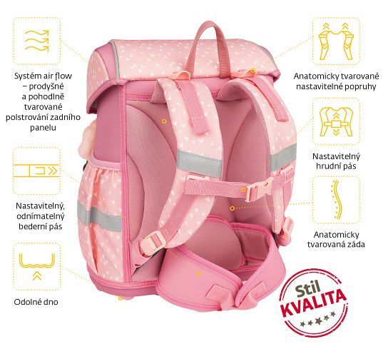 Kvalitní, ergonomická a velmi odolná školní aktovka je vybavena reflexními prvky a anatomicky tvarovanými zády s pevnou konstrukcí