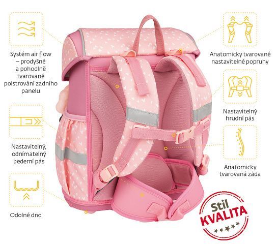 - POHODLÍ – výškově nastavitelný hrudní a nově i odnímatelný bederní pás s kvalitní přezkou zajistí pohodlné usazení aktovky na zádech dítěte i správné rozložení váhy