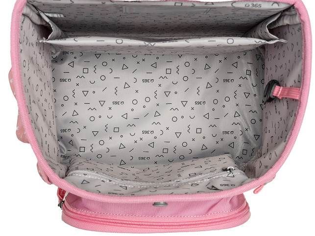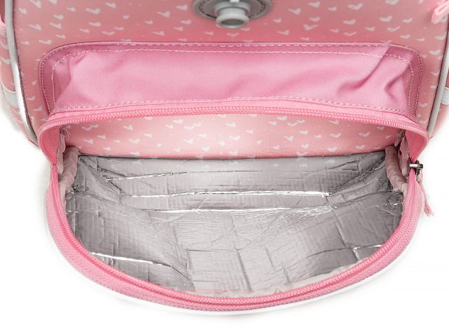- VNITŘNÍ USPOŘÁDÁNÍ – prostorná hlavní vnitřní komora je rozdělená látkovou přepážkou pro uložení boxu na sešity či knih. Součástí hlavní komory je také kapsička pro uložení drobností, odepínatelný kroužek na klíč a štítek na jméno a adresu. Ve víku je průhledná kapsička na rozvrh hodin
